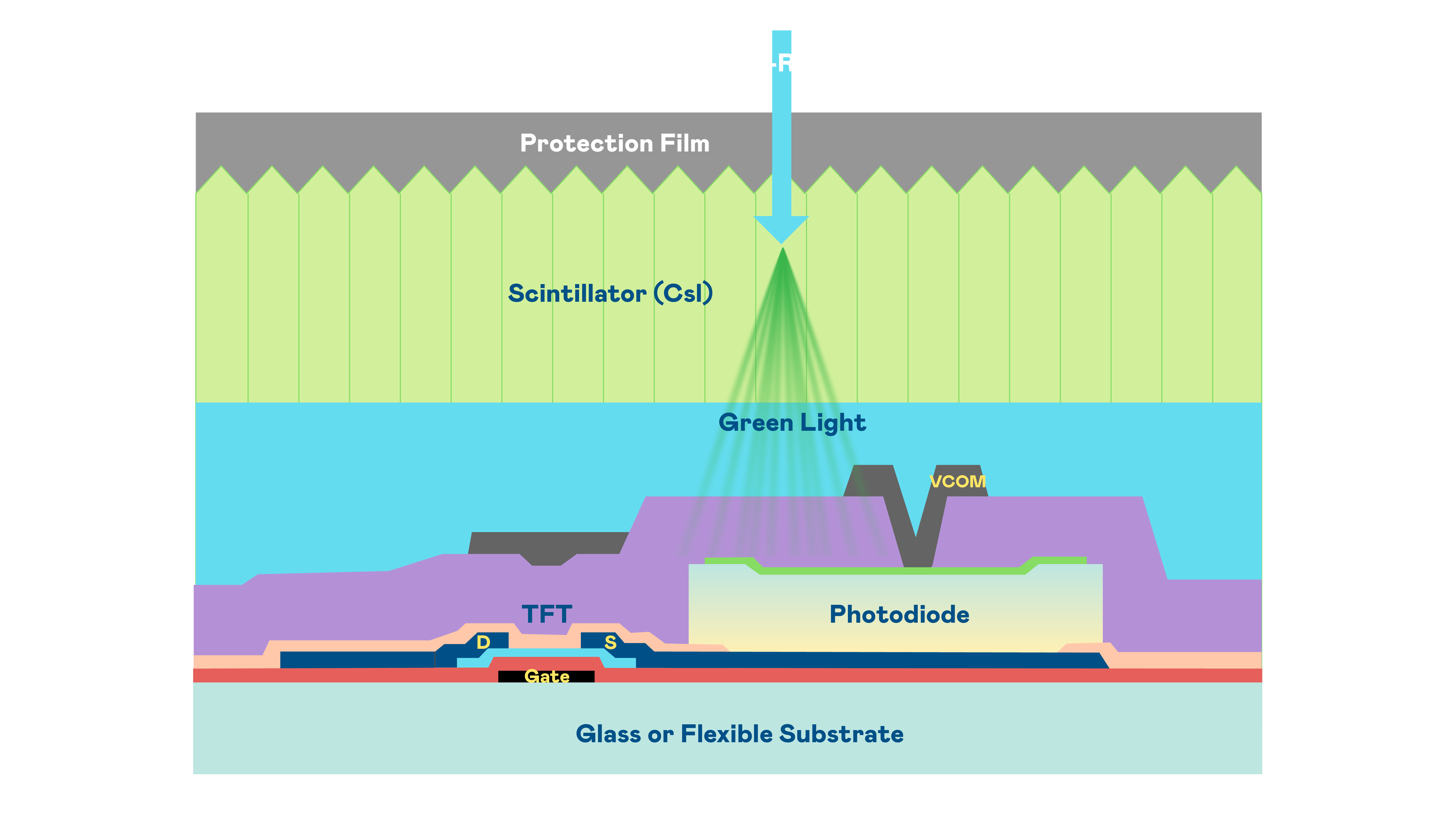 尊龙凯龙时官网进入的X光影像感測陣列使用薄膜電晶體 (TFT) 作為每個像素的讀取開關,搭配光電二極體(Photodiode)的光電轉換元件,用以感測X光影像訊號。